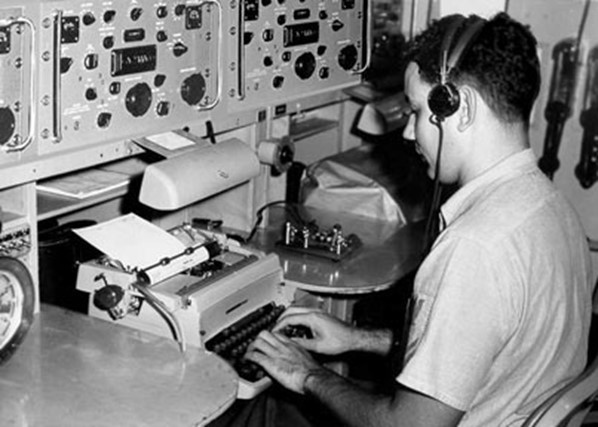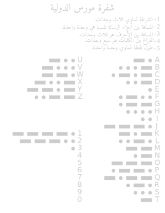 شفرة مورس ، بهذه الطريقة كانت تكتب الأحرف والأرقام حيث إن الحرف يمثل بعدد من الشرط والنقاط ولكل حرف ورقم ترميز معين.